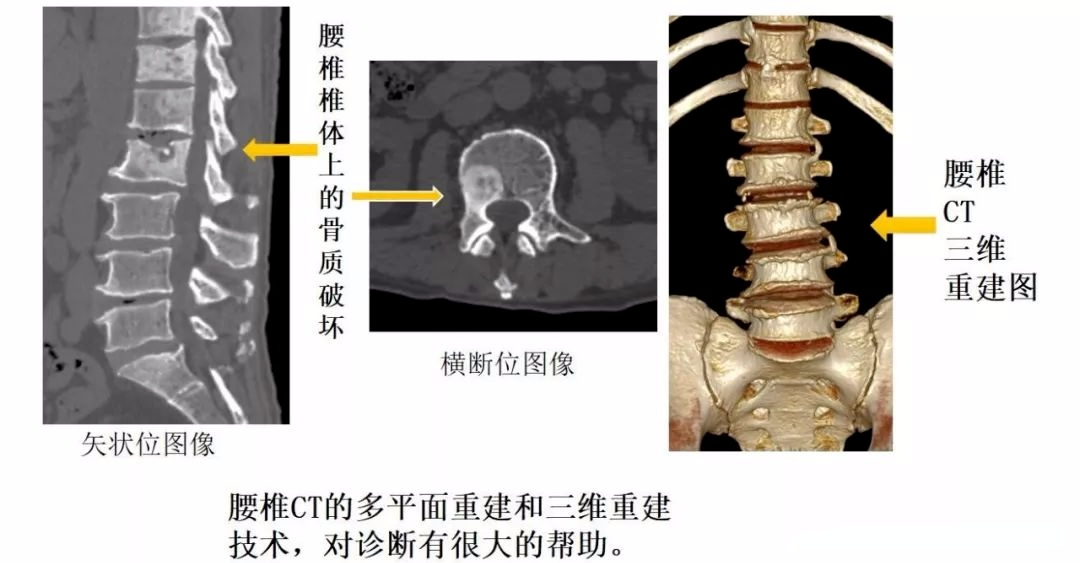 除此以外,腰椎CT检查还有两个优势。第一,CT扫描可以做到薄层重建,能把腰椎横断面分解成几百幅图像,能更好的看清细小的病变,特别是微小的骨折。第二,在扫描结束后可以通过影像后处理的方法,把腰椎图像重建成矢状位或冠状位,可从多个平面的不同角度去观察腰椎的影像情况。