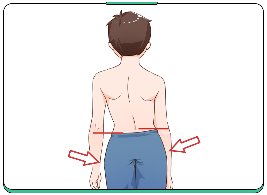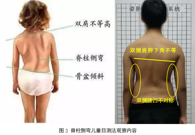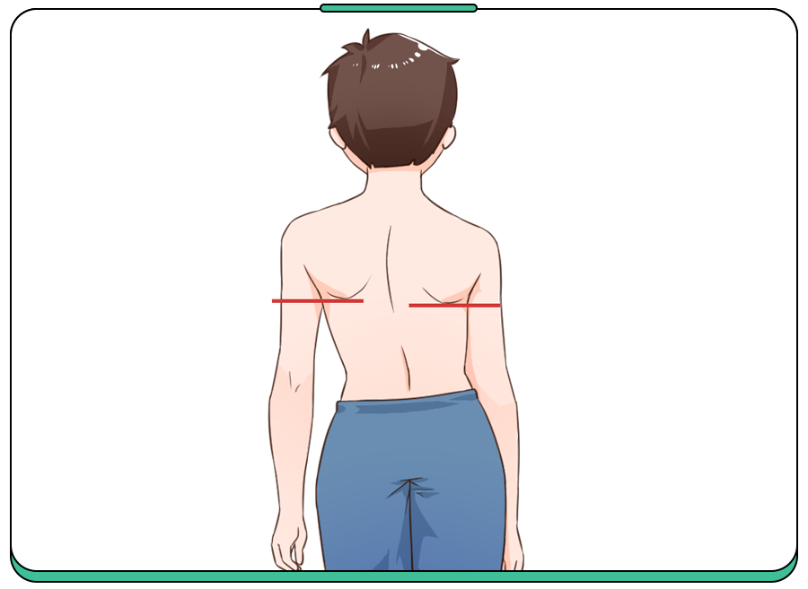 主要让孩子上身裸露(男)或上身穿内衣(女),双足与肩等宽,身体放松自然站立,从背面观察患者双肩是否等高、左右肩胛骨在脊柱两侧是否对称、骨盆是否水平等。