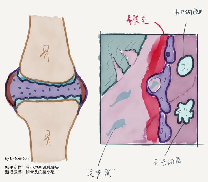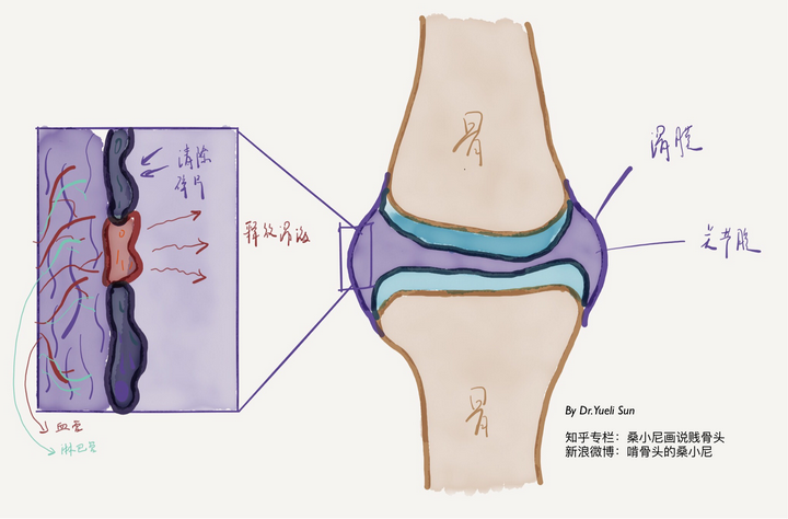 所以,我尝试了下,用手绘的方法,让抽象的知识显得形象易懂一些,这次就先从「关节炎」的炎症开刀,让我试着用——