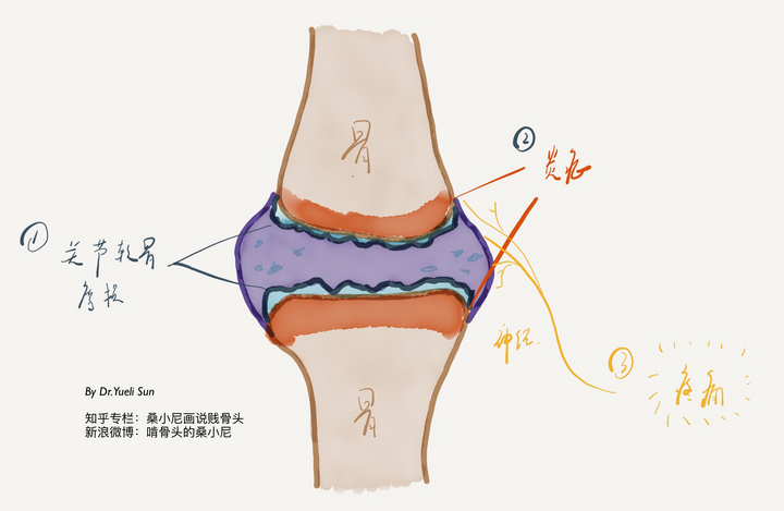 关节软骨被磨损下来的软骨碎片(「关节鼠」)在关节腔里到处游离,拖离软骨表面后,它们就成了我们身体的异物了,免疫系统都会捕捉它们消灭它们,战场上留下的就是「炎症反应」。