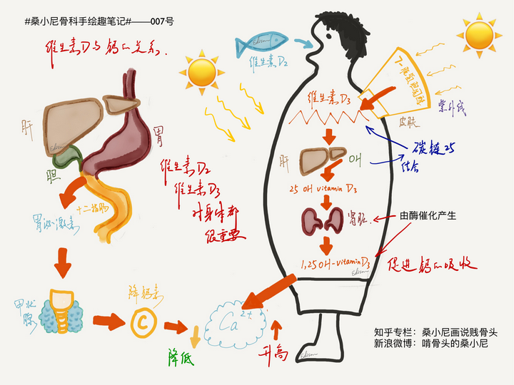 维生素D2和维生素D3,都只是生理必需的“原料”,它们本身没有活性,都是要经过紫外线照射,以及肝、肾细胞的两次转化生成1,25-二羟基维生素D2后,才能促进钙、磷在小肠内的吸收。当维生素D缺乏时,人体吸收钙、磷的能力下降,血中钙、磷水平较低,成骨作用受阻,甚至发生骨盐再溶解——儿童称为「佝偻病」,成人称为「骨软化病」