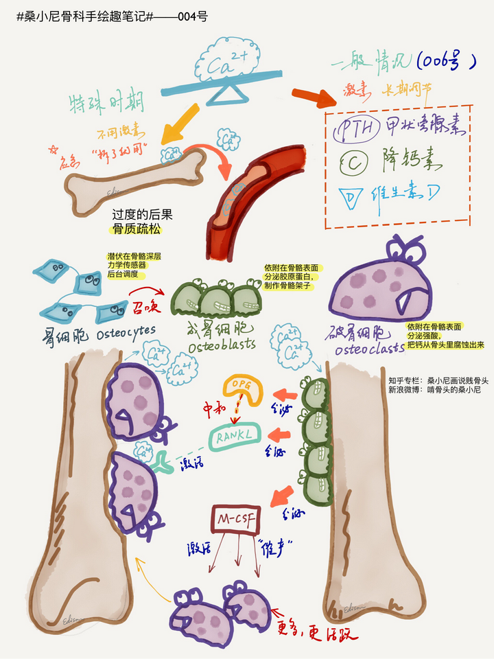如果“暂时的”营养不良,身体里的钙磷来不及维持日常的生理功能,身体就会调用骨头这个「临时发货站」,破骨细胞被激活,在骨头表面突出酸水,腐蚀骨头把钙和磷溶解出来,当身体的钙达到所需要的水平之后,破骨细胞就会自动停工,不再继续搞破坏了。