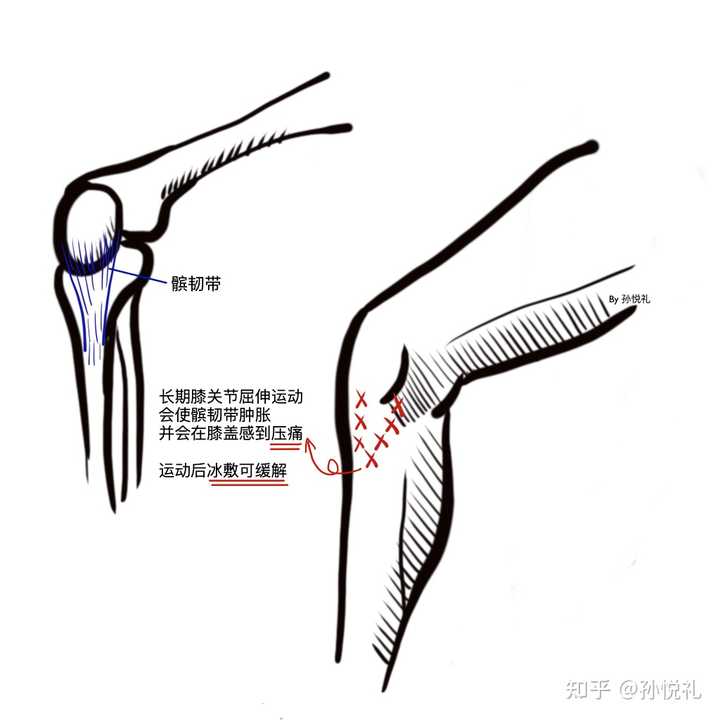来自长期运动时产生的大量的水分,渗透到韧带就会形成肿胀,肿胀的韧带在弹性和强度上都会变得大不如常。因此,长时间运动后,用手轻压膝盖前侧和外侧,常常会感到明显的压痛,也会摸到膝盖前侧凸起的髌骨周围韧带附着的地方有肿胀、钝厚的感觉。