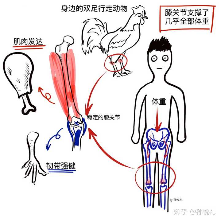 为了让机械机关滑轮组动起来,连接在骨头各个位置的肌肉韧带就开始协同配合,随着收紧和放松,膝关节就能做出屈伸的活动(踢腿和收腿)。