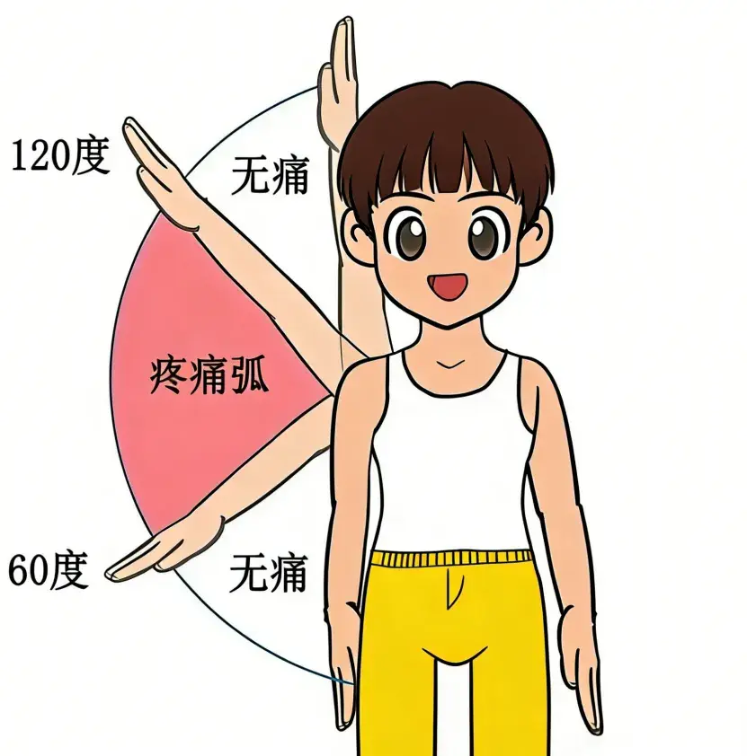 1.如果手臂抬到一半(大概30-60度)突然卡住,再用力也抬不上去,还伴随钻心的疼——大概率是肩周炎(也叫冻结肩)! 相当于肩膀的关节囊“粘住了”,就像生锈的合页,越用力掰越疼,根本转不动。
